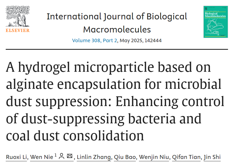 近期,山东科技大学安全与环境工程学院聂文教授团队通过微生物包埋技术,制备出一种海藻酸钠封装抑尘水凝胶微粒。该微粒解决了传统液态微生物抑尘剂存储和应用不便的难题,通过一系列作用机制显著提升煤尘固结效果,有效抑制粉尘扩散。相关研究以“A hydrogel microparticle based on alginate encapsulation for microbial dust suppression: Enhancing control of dust-suppressing bacteria and coal dust consolidation”为题目,发表在期刊《International Journal of Biological Macromolecules》上。