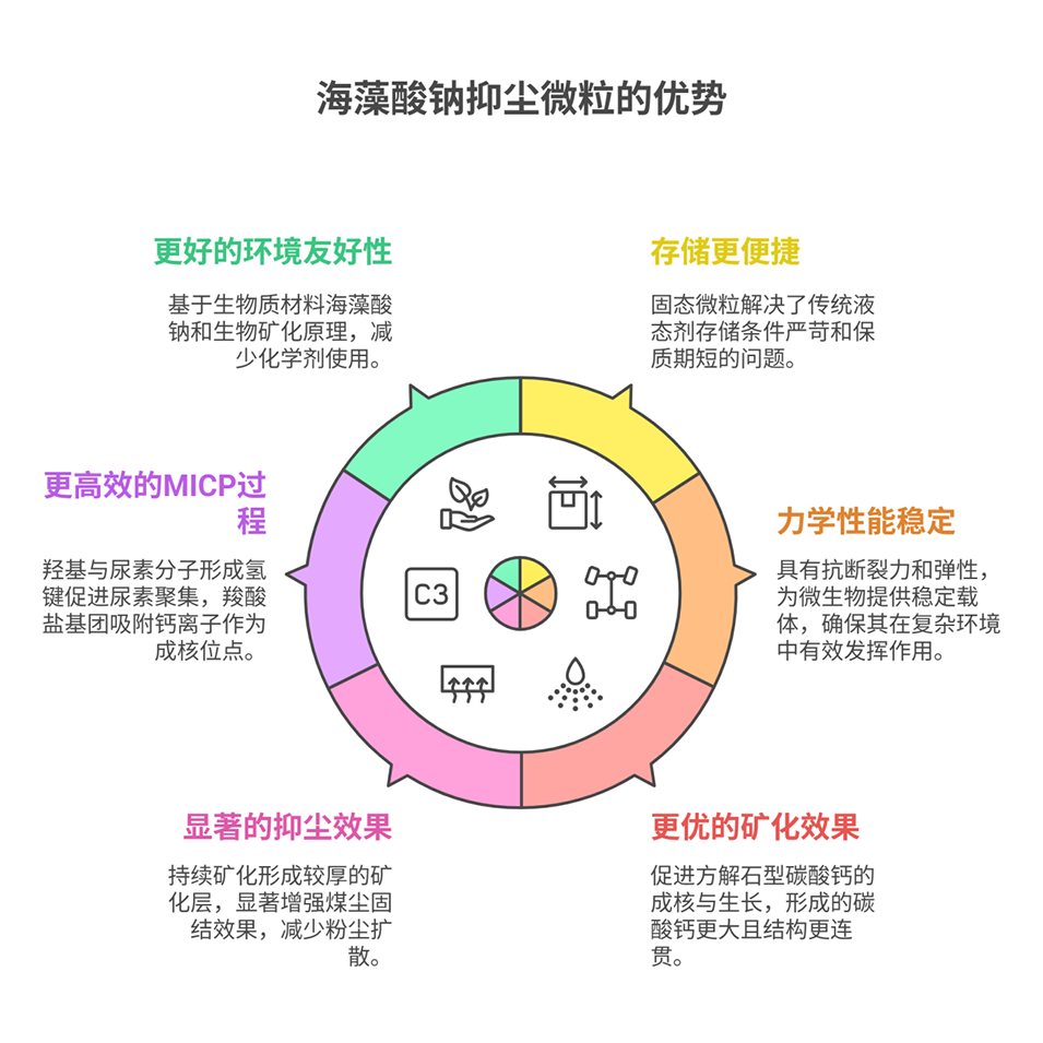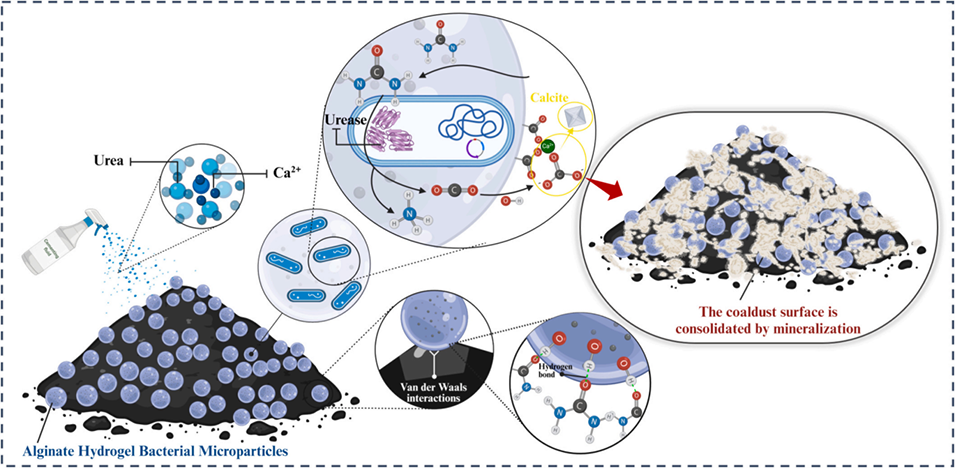 5、持续生长的碳酸钙将水凝胶微球与煤尘固结形成矿化层,有效抑制粉尘扩散。该研究为露天煤矿粉尘控制提供了一种简单、低成本且高效的固态微生物抑尘剂新方法。