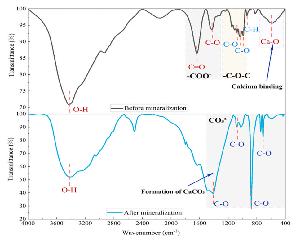 图2.海藻酸钠水凝胶细菌微粒的傅里叶变换红外光谱:矿化前后化学键的变化