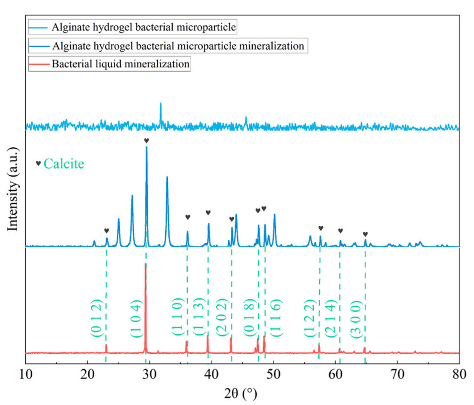 图3.冻干水凝胶微粒及水凝胶微粒与细菌培养液矿化产物的X射线衍射图谱