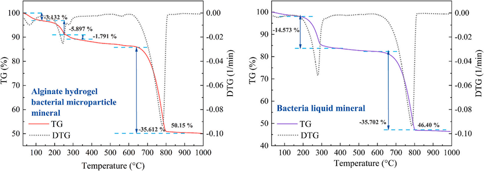 图5.矿化产物的热重-微分热重曲线:海藻酸钠水凝胶细菌微粒与细菌培养液