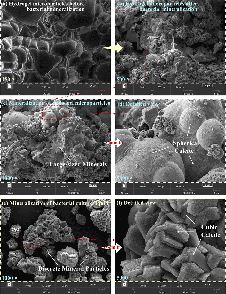 图4.矿化过程的扫描电镜图像:(a-b)细菌矿化前后的水凝胶微粒;(c-d)矿化水凝胶微粒的细节图;(e-f)细菌培养液的矿化情况及细节图