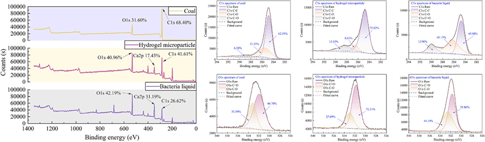 图7.煤样的X射线光电子能谱分析:原煤粉尘及经水凝胶微粒与细菌培养液矿化固结的煤尘