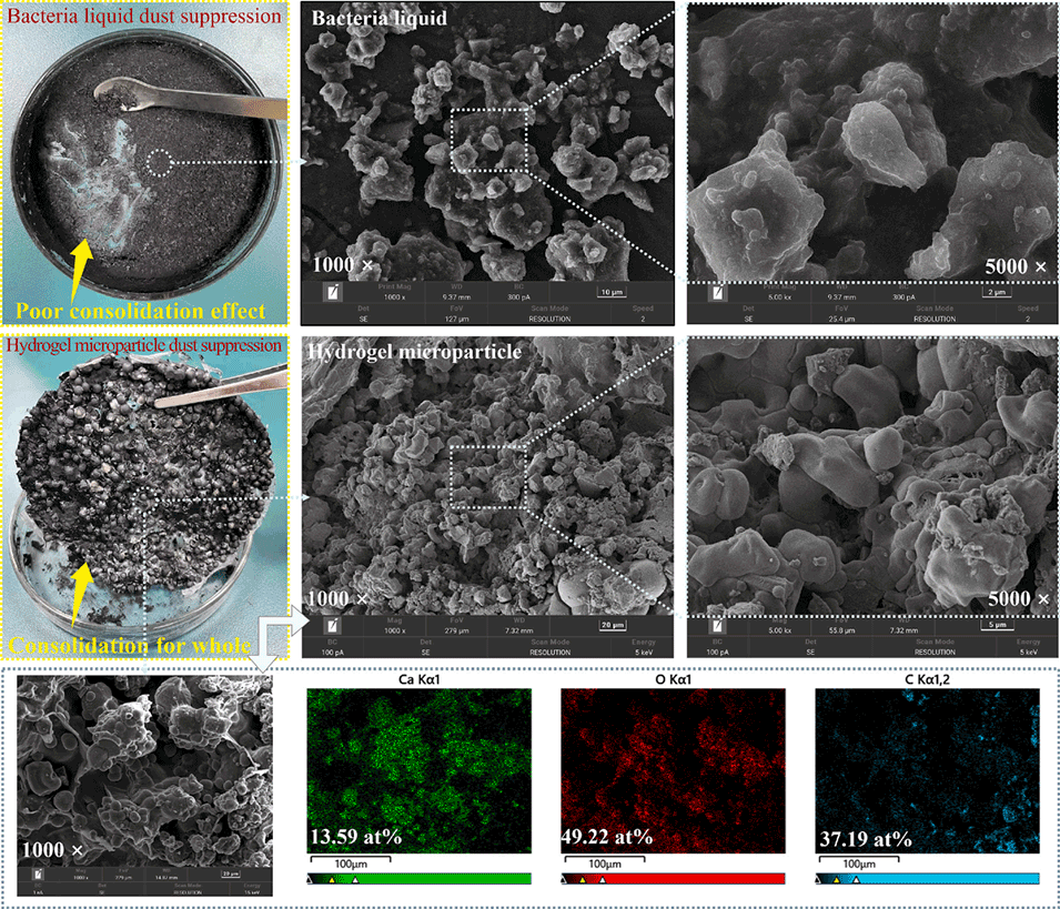 图6.煤尘固结的多尺度分析:宏观效果、微观结构形态及表面元素分布