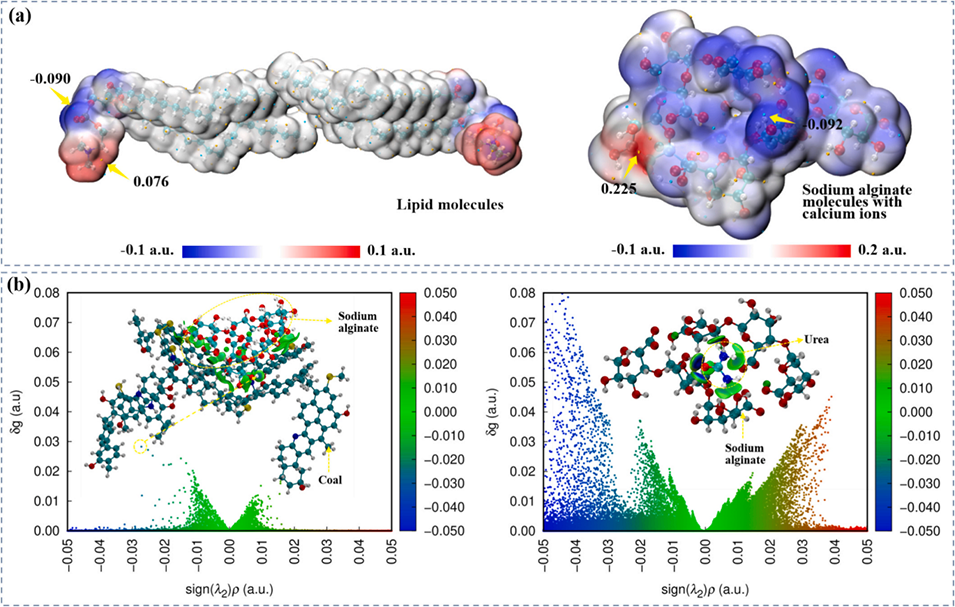 图8.分子模型分析:(a)磷脂分子与海藻酸钙分子的静电势分布;(b)海藻酸钙分子与煤或尿素分子的弱相互作用