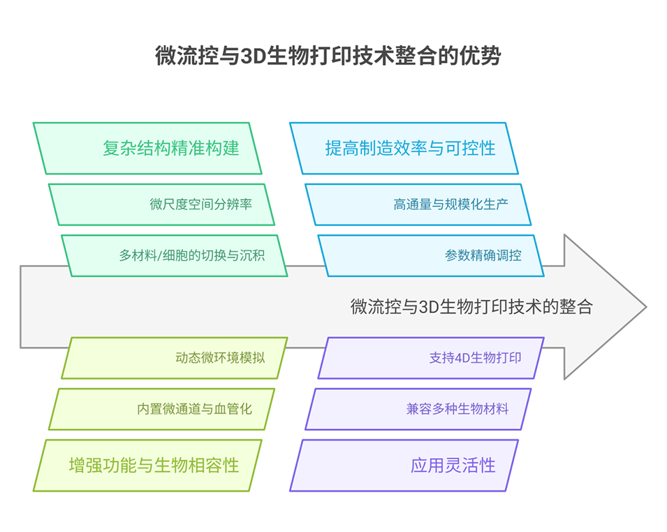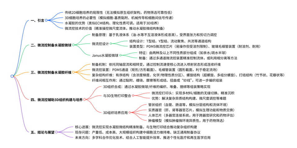 水凝胶因其与细胞外基质(ECM)相似的结构和可调的理化性质,成为极具潜力的3D细胞培养支架。微流控技术通过精确控制流体,实现了水凝胶微球和微纤维的高精度制备,为可扩展的3D组织组装提供了模块化单元。结合3D生物打印技术,这些结构可进一步构建复杂空间构型。微流控与生物打印的协同整合克服了传统3D培养的局限(如静态微环境和低分辨率),并赋予体系微尺度异质性、动态剪切流和梯度生成能力,显著推动了类器官和器官芯片的发展。