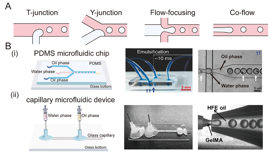 图1. A:微流控装置中用于生成水凝胶微球的通道几何结构。微流控装置主要有四种基本类型:T型结、Y型结、流动聚焦型、共流型。B:用于制备微流控水凝胶微球的装置及其各自的实验图像。(i)PDMS微流控芯片。(ii)毛细管微流控装置。