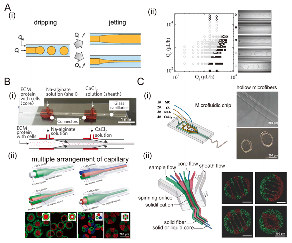 图3. A:(i)通过增加内相Qi或外相Qe的流速,在微流控结构中实现滴落-喷射转变。(ii)相图展示了在共流微流控装置中观察到的模式变化。B:(i)使用双同轴微流控装置制备的细胞包封水凝胶微纤维。(ii)用于生成核-壳型、多核型、多层型、多组分水凝胶纤维的毛细管装置示意图。C:(i)用于制造水凝胶纤维的微流控芯片及水凝胶纤维的图像。(ii)微流控芯片具有多个不同深度的平行凹槽结构,可提供海藻酸盐和水用于生成分离的多种Janus多孔纤维。