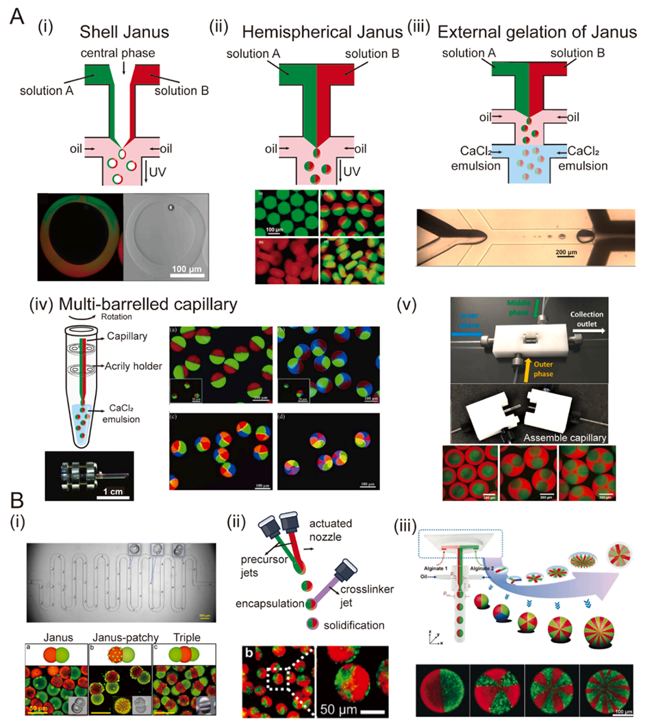 图2. A:经典Janus水凝胶微球的微流控设计。(i)由三个独立流形成水凝胶微球的微流控装置示意图。下图展示了实验中获得的中空Janus壳层的荧光图案和明场显微照片。(ii)一种带有两个Y型结的微流控装置用于制备Janus微球,以及通过该装置获得的不同形状水凝胶微球的荧光图像。(iii)通过外部凝胶法制备Janus水凝胶微球的示意图。通过控制两个上游输入,可制备负载半球形磁性纳米颗粒的Janus水凝胶微球。(iv)基于离心的多管毛细管装置可用于获得具有轴对称几何形状的多室水凝胶颗粒。(v)一种新型可自由拆卸和组装的玻璃毛细管装置。该新型装置通过移动内部毛细管来创建多核液滴。B:基于各种材料的其他微流控装置。(i)带有流动聚焦结构并结合相分离系统的微流控芯片示意图,以及制备出的具有Janus、Janus patchy和三重结构的微球。图中展示了Janus液滴在连续弯曲通道中的相分离全过程。(ii)用于生成Janus微球的“空气微流控”(IAMF)概念图。(iii)利用微流控芯片与毛细管装置集成的微球生成器,实现了六室、十室和二十室微球的制备。