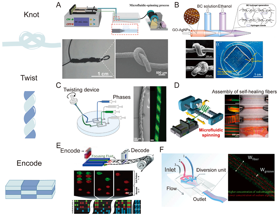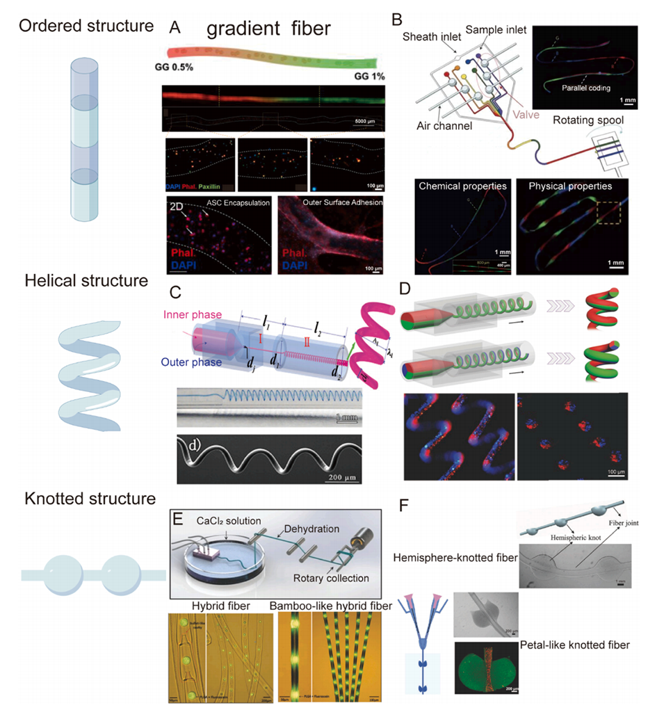 图4. 通过微流控技术控制纤维的形态:有序结构、螺旋结构和打结结构。A:梯度水凝胶纤维以及梯度中不同的细胞响应。B:纵向生成的具有不同化学和物理性质的区域。C:通过毛细管微流控装置生成的螺旋纤维。D:微流控制备的多组分螺旋水凝胶纤维。E:带有三个流动通道的平面芯片生成的竹节状纤维。F:半球形打结纤维和花瓣状打结纤维的形成。