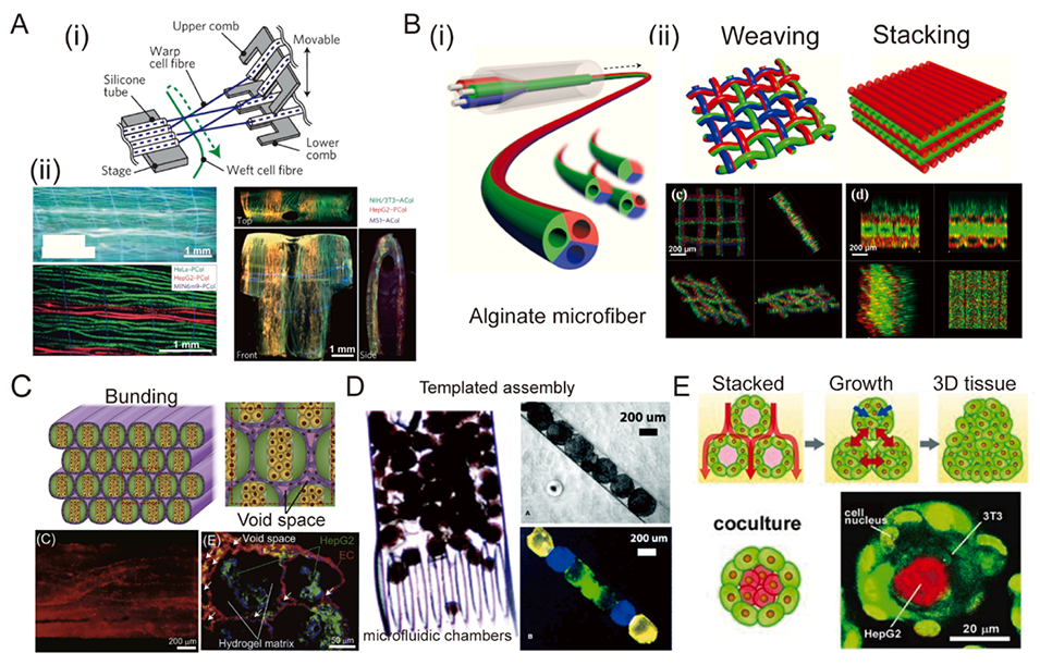 图6. 复杂3D组织的构建单元。A:(i)用于制造3D细胞结构的微流控“器官编织”装置。(ii)复合水凝胶微纤维的编织应用。B:(i)带有三个平行注射毛细管和支架的微流控装置。(ii)通过编织或堆叠纤维,制备出具有可调节化学组成和物理结构的水凝胶纤维。C:水凝胶纤维被捆绑并培养成多细胞肝组织。D:包含三组不同标记细胞的凝胶模块的模板组装。单分散水凝胶微球与另一种细胞类型包封成3D组织结构。