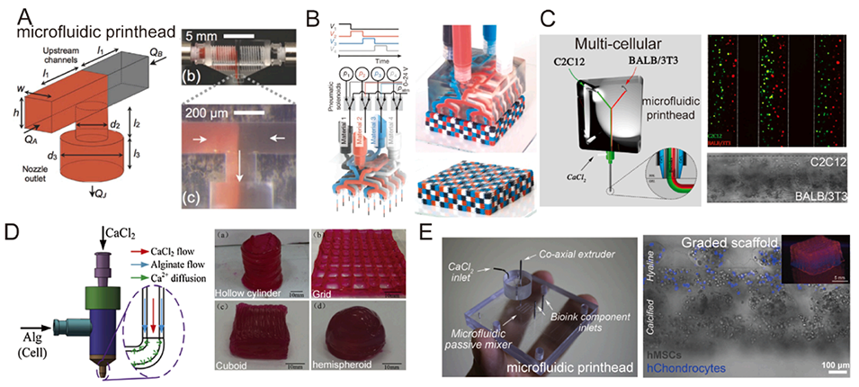 图7. 微流控打印头的结构和研究进展。A:多材料微流控打印头示意图。B:使用4×4喷嘴和四种材料进行MM3D打印产生的体素化物质。C:通过微流控打印头对C2C12成肌细胞和BALB/3T3成纤维细胞进行3D生物打印。D:使用同轴喷嘴辅助的3D生物打印系统打印3D海藻酸盐结构。E:由微流控打印头和同轴适配器组成的微流控挤出系统,展示了打印的3D生物打印梯度支架。