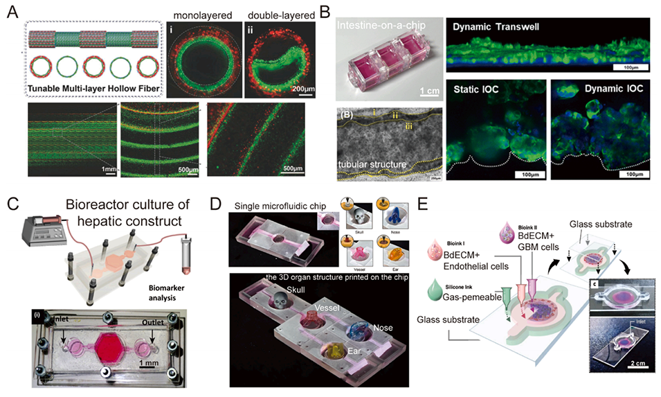 图8. 应用于不同器官的微流控器官芯片。A:双层中空管的示意图,以及双层到单层中空管的动态转换。B:类似小肠的预期管状结构,以及Transwell和肠芯片的静态培养与动态培养对比。C:肝脏微流控芯片平台的制造:在装置中构建微组织生物打印,随后组装生物反应器芯片并灌注细胞培养基。D:单个微流控芯片和多器官微流控芯片上3D器官结构的示意图。E:在微流控芯片上使用各种生物墨水打印胶质母细胞瘤,以构建分区结构。