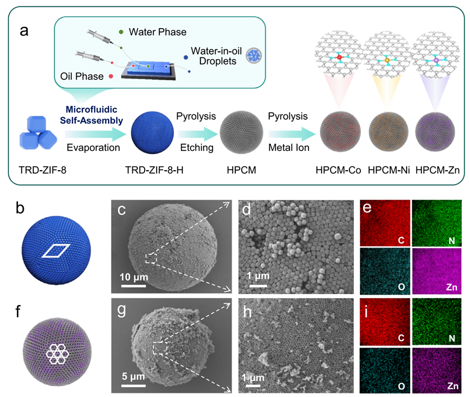 图1. a) HPCM-Co、HPCM-Ni和HPCM-Zn的合成过程示意图。b) TRD-ZIF-8-H的三维模型、c,d)扫描电镜图像及e)相应的EDS元素映射图像。f) HPCM-Zn的三维模型、g,h)扫描电镜图像及i)相应的EDS元素映射图像。