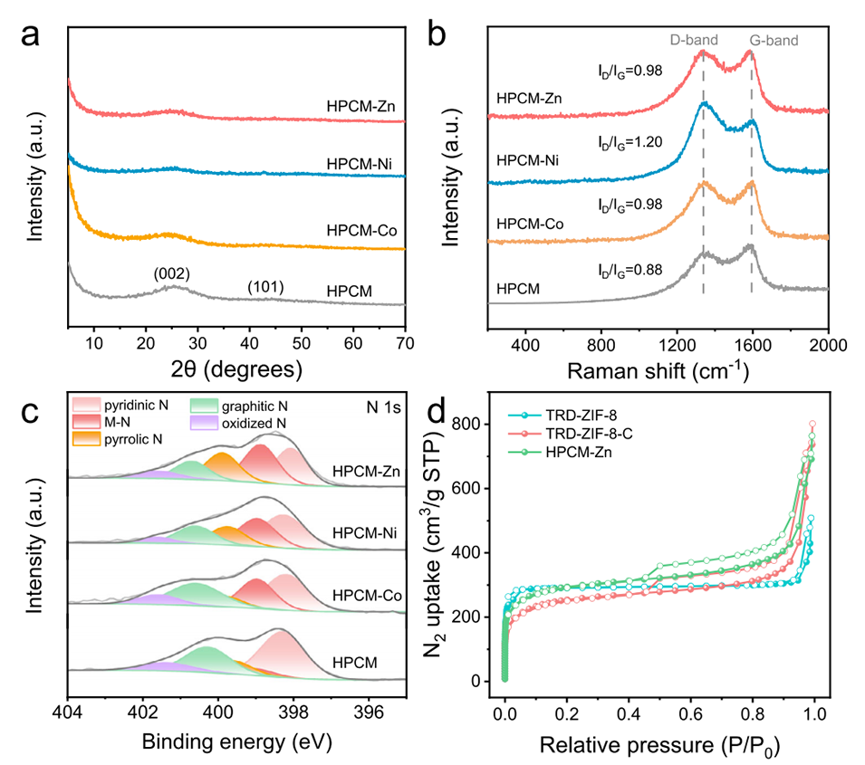 图2. a) HPCM-Zn、HPCM-Co、HPCM-Ni和HPCM的粉末X射线衍射图谱,b)拉曼光谱,c)高分辨反卷积XPS光谱,d) TRD-ZIF-8、TRD-ZIF-8-C和HPCM-Zn在77K下的氮气吸附-脱附等温线。