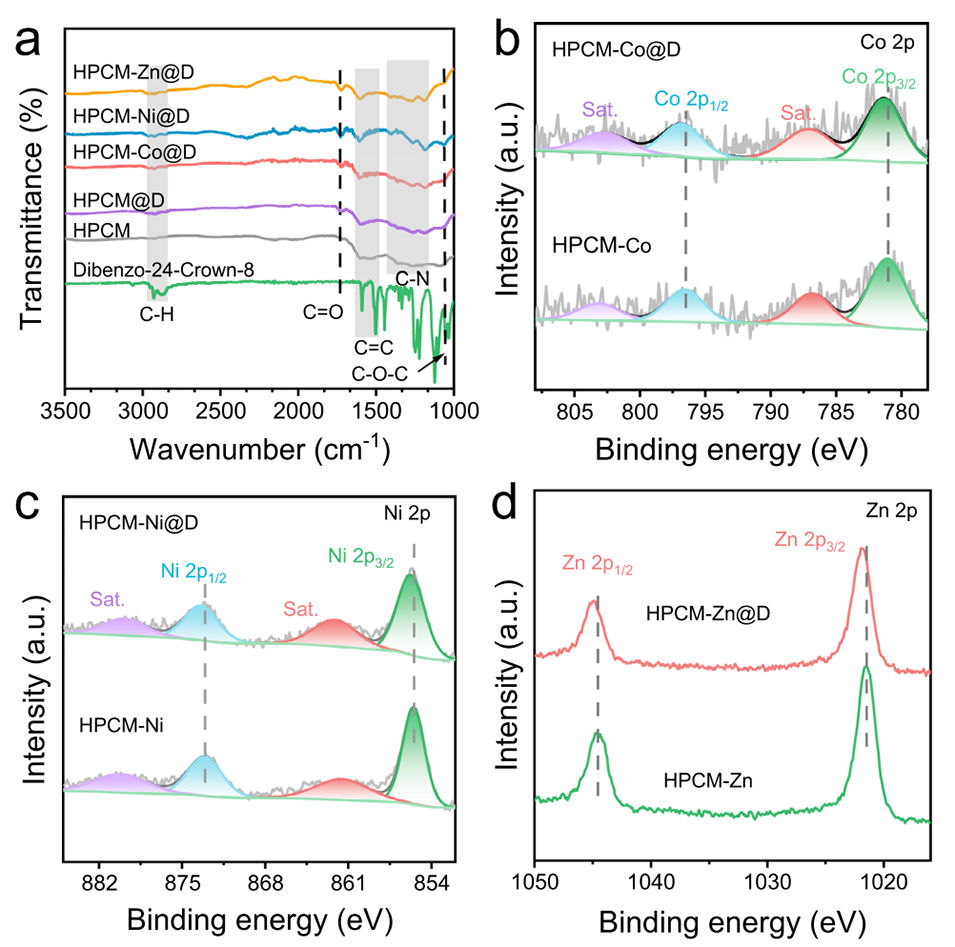 图3. a)样品的傅里叶变换红外光谱。b) Co2p、c) Ni2p和d) Zn2p的高分辨反卷积XPS光谱。