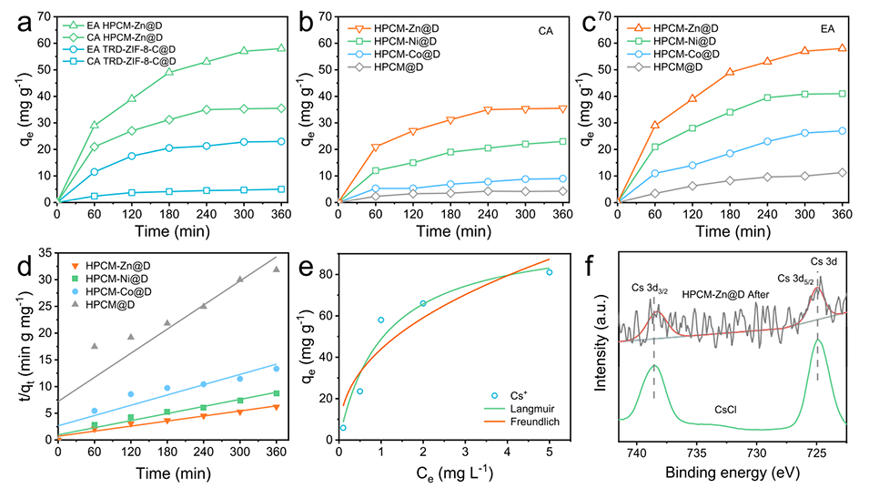 图5. a)在常规吸附(CA)和电化学吸附(EA)中,TRD-ZIF-8-C@D和HPCM-Zn@D对Cs+的吸附容量随时间变化。b)常规吸附和c)电化学吸附中,HPCM@D和HPCM-M@D对Cs+的吸附容量随时间变化。d) HPCM@D和HPCM-M@D对Cs+的电化学吸附伪二级动力学曲线。e) HPCM-Zn@D对Cs+的Langmuir和Freundlich吸附等温线模型。f) CsCl和反应后HPCM-Zn@D的Cs3d XPS光谱。