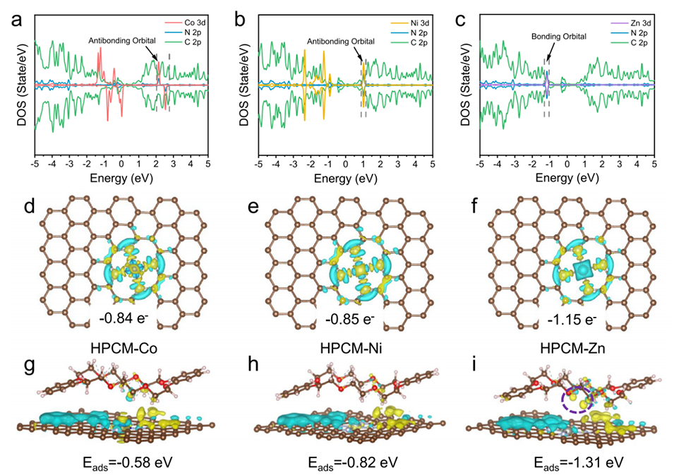 图4. a) HPCM-Co、b) HPCM-Ni和c) HPCM-Zn的局域态密度。d) HPCM-Co、e) HPCM-Ni和f) HPCM-Zn的电荷密度差分图(等值面数值为0.004 e/bohr³)。g) HPCM-Co@D、h) HPCM-Ni@D和i) HPCM-Zn@D的吸附能及电荷密度差分图(等值面数值为0.0002 e/bohr³)。黄色和青色区域分别代表电荷积累和电荷损耗。