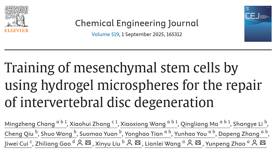干细胞疗法结合药物递送系统是修复退行性疾病的潜在策略,但生物材料的免疫排斥及退化组织的炎症、氧化应激微环境会导致干细胞凋亡和命运异常,修复效率低下。近期,山东大学齐鲁医院刘新宇教授、赵云鹏副教授、王连雷副教授、高至亮副研究员等人联合研发了一种负载促红细胞生成素的羧甲基壳聚糖/单宁酸水凝胶微球,通过该微球对间充质干细胞进行体外训练,显著提升了干细胞在椎间盘退变修复中的存活、分化及功能发挥。相关研究以“Training of mesenchymal stem cells by using hydrogel microspheres for the repair of intervertebral disc degeneration”为题目,发表在期刊《Chemical Engineering Journal》上。