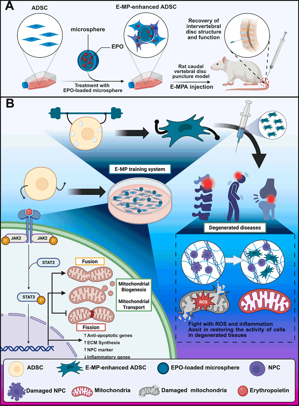 图1.(A)EPO负载水凝胶微球训练系统增强ADSCs修复退行性疾病能力的机制及促进IVDD修复的机制示意图。(B)EPO负载羧甲基壳聚糖(CMCS)/单宁酸(TA)微球(E-MP)增强的ADSCs治疗IVDD的示意图。