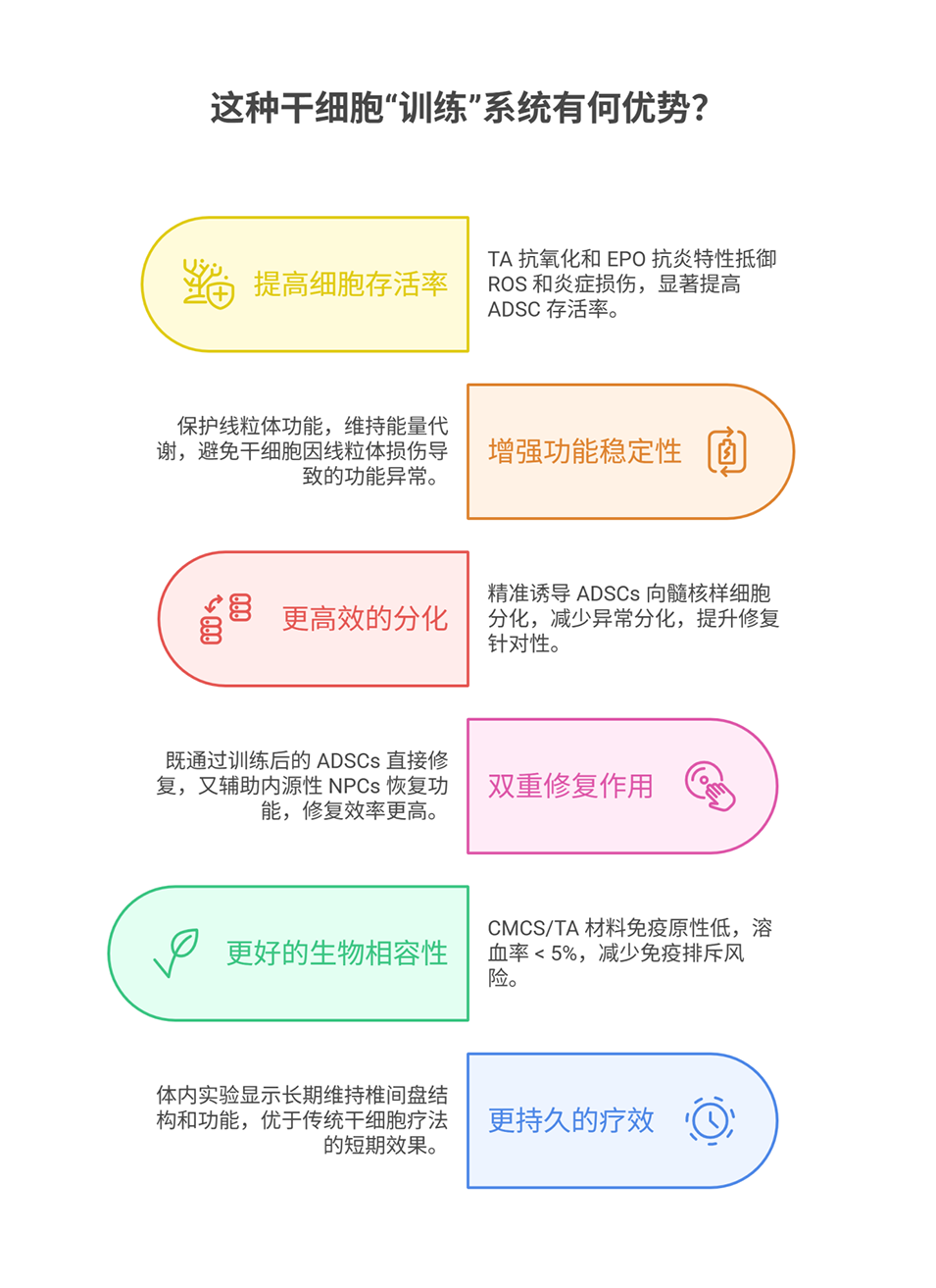3、TA和EPO的递送赋予脂肪间充质干细胞(ADSCs)更强的抗炎和抗活性氧损伤能力,改善线粒体活性,支持其向髓核样表型分化,且经处理的ADSCs能帮助髓核细胞恢复功能。