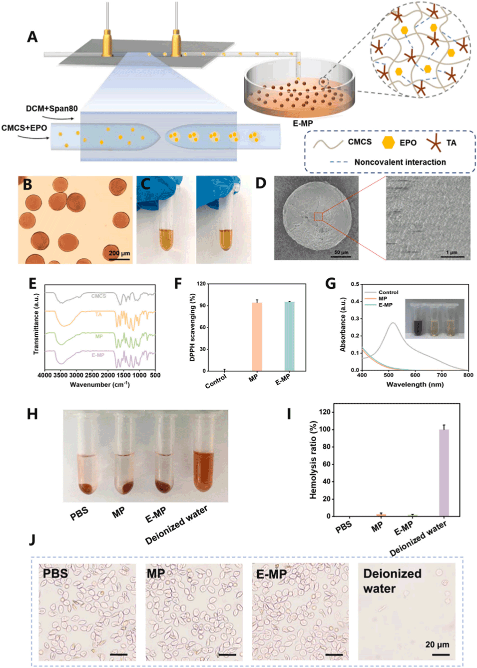 图2. E-MP的制备与表征。(A)通过微流控技术制备E-MP的示意图。(B)单分散E-MP的光学显微图。(C)E-MP悬浮液在轻轻搅拌下的均一性(左)和5分钟沉降后的相分离(右)的宏观观察。(D)扫描电镜(SEM)图像显示球形形态和光滑的表面形貌。(E)CMCS、TA、MPs和E-MP的傅里叶变换红外(FT-IR)光谱,证实无共价相互作用。(F)通过DPPH测定评估的自由基清除能力。(G)MPs与E-MP的紫外-可见吸收光谱比较。(H)经磷酸盐缓冲液(PBS,阴性对照)、水(阳性对照)、MP和E-MP处理的红细胞悬液的照片记录。(I)定量溶血率。(J)不同暴露后红细胞完整性的显微镜观察。