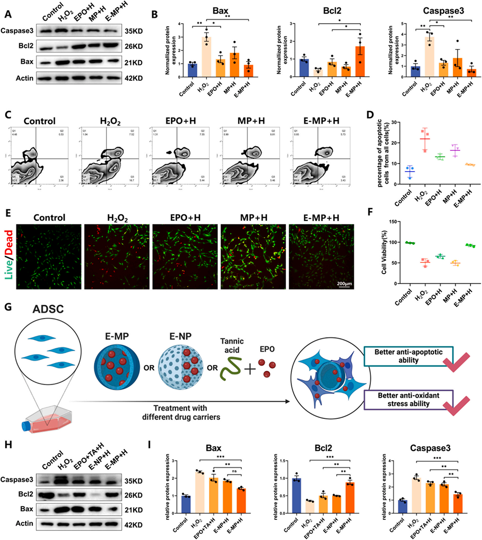 图3. E-MP增强ADSCs在H2O2诱导的氧化应激下的存活能力。(A)H2O2刺激24小时后,经微球或EPO处理的ADSCs的代表性显微图像。(B, C)在H2O2刺激下,用E-MP、MP和EPO培养的大鼠ADSCs中半胱天冬酶-3(Caspase-3)、B细胞淋巴瘤-2(Bcl-2)和Bcl-2相关X蛋白(Bax)表达的蛋白质印迹(WB)分析。(D, E)经H2O2处理或未处理ADSCs凋亡的流式细胞术分析。(F)不同条件下活细胞(绿色)和死细胞(红色)的荧光成像。(G)三种不同药物载体(EPO负载微球、EPO负载纳米颗粒(E-NPs)以及仅单宁酸和EPO)增强ADSCs效能的示意图。(H, I)在H2O2刺激下,经E-MP、E-NPs和EPO+TA处理的大鼠ADSCs中Caspase-3、Bcl-2和Bax表达的WB分析。数据表示为平均值±标准差;与H2O2组或E-MP+H组相比,*p<0.05,*p<0.01,*p<0.001和*p<0.0001。