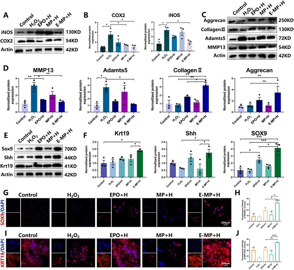 图5. E-MP增强ADSCs的抗炎反应、细胞外基质(ECM)合成和髓核样分化。(A-D)在氧化应激条件下,用E-MP培养的大鼠ADSCs中MMP-13、ADAMTS5、COX-2、iNOS、Ⅱ型胶原蛋白和聚集蛋白聚糖的WB分析。(E, F)经E-MP处理的ADSCs中Sox9、Shh和KRT19表达的WB分析。(G-J)各实验组ADSCs中Sox9和KRT19的免疫荧光染色。数据表示为平均值±标准差;与H2O2组或E-MP+H组相比,*p<0.05,*p<0.01,*p<0.001和*p<0.0001。