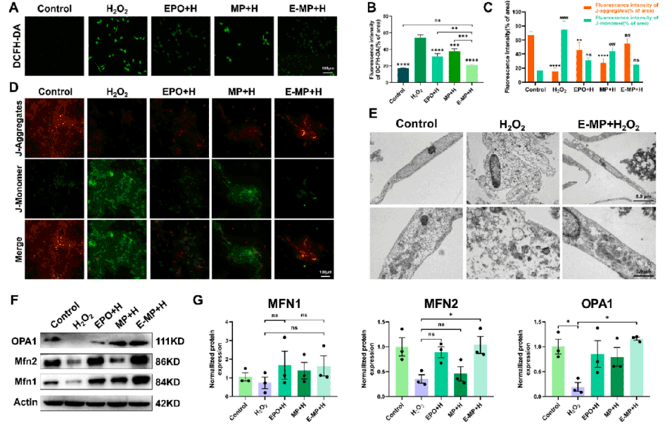 图4. E-MP通过减轻氧化应激和增强线粒体生物发生,对H2O2刺激的ADSCs的线粒体功能具有保护作用。(A, B)不同实验组中H2O2处理后ADSCs内ROS水平的DCFH-DA染色。(C, D)H2O2处理后各组ADSCs线粒体膜电位的JC-1染色检测。(E)通过透射电镜(TEM)观察细胞形态和线粒体。(F, G)在H2O2刺激下,用E-MP、MP和EPO培养的大鼠ADSCs中线粒体融合蛋白1(MFN1)、线粒体融合蛋白2(MFN2)和视神经萎缩蛋白1(OPA1)的WB检测。数据表示为平均值±标准差;与对照组、H2O2组或E-MP+H组相比,*p<0.05,*p<0.01,*p<0.001和*p<0.0001。
