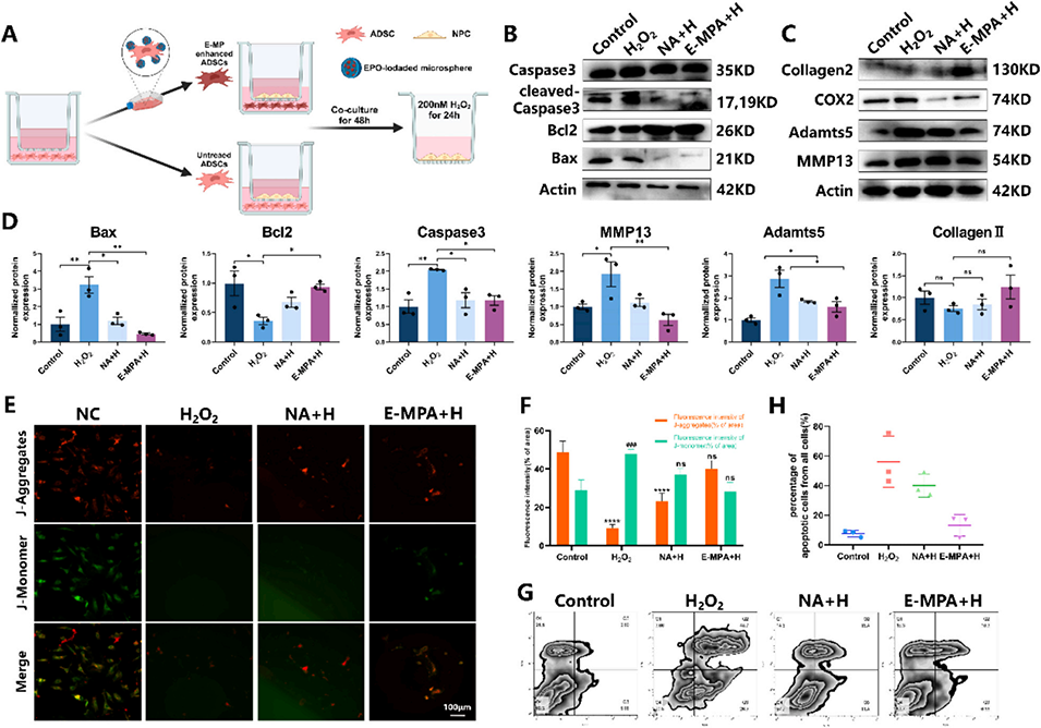 图6. E-MP训练的ADSCs在H2O2刺激下增强髓核细胞(NPCs)的活性。(A)ADSCs与NPCs共培养系统的示意图。(B-D)与ADSCs共培养的大鼠NPCs中Bax、Bcl2、Caspase-3、MMP-13、Adamts5、COX-2和Ⅱ型胶原蛋白表达的WB分析。(E, F)H2O2处理后NPCs线粒体膜电位的JC-1染色评估。(G, H)不同处理条件下NPC凋亡的流式细胞术分析。数据表示为平均值±标准差;与H2O2组或E-MP+H组相比,*p<0.05,*p<0.01和*p<0.001。