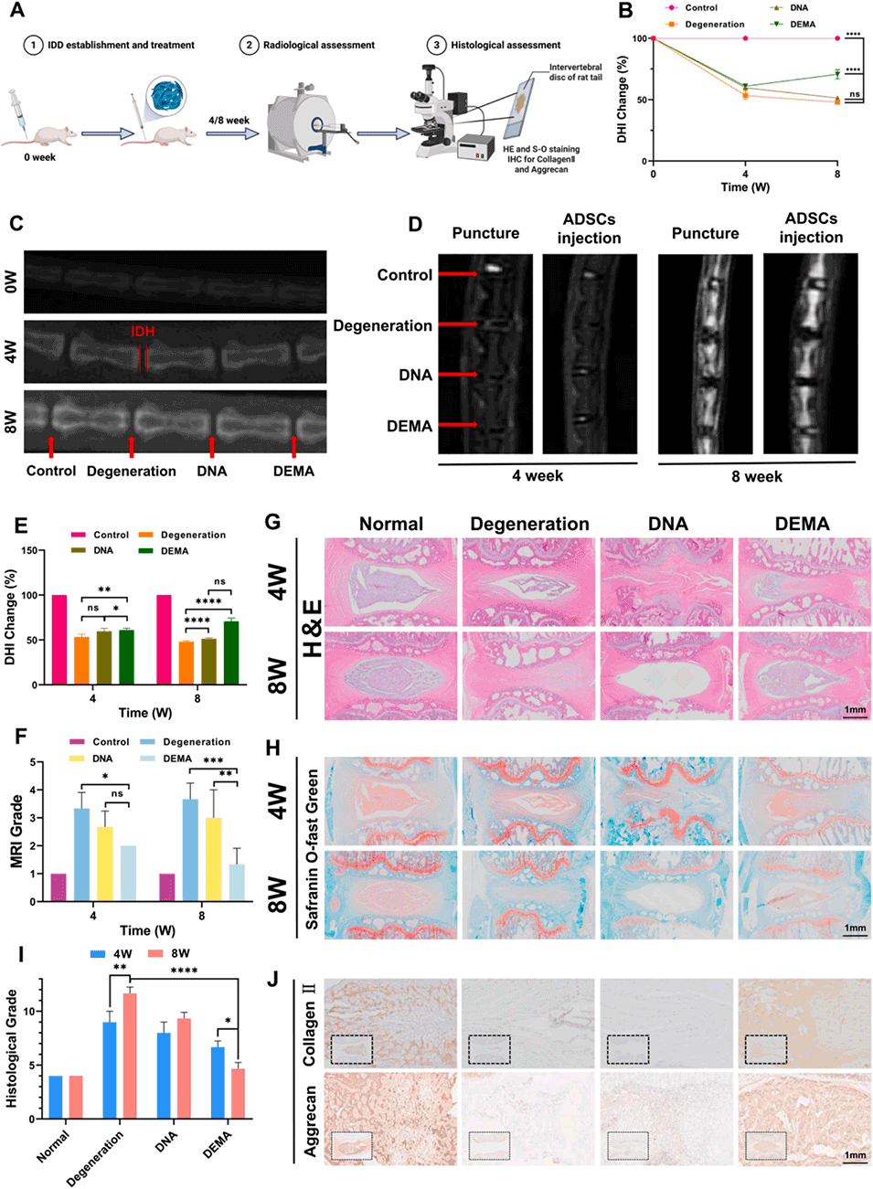 图7.在大鼠IVDD模型中的体内治疗效果。(A)E-MP增强的ADSCs治疗大鼠IVDD的示意图。(B-D)ADSCs注射后4周或8周的椎间盘高度指数(DHI)变化。(E, F)ADSCs注射后4周或8周的磁共振成像(MRI)分级变化。(G)大鼠椎间盘切片的苏木精-伊红(H&E)染色。(H)大鼠椎间盘切片的番红固绿染色。(I)大鼠椎间盘样本的组织学分级。(J)大鼠椎间盘切片中聚集蛋白聚糖和Ⅱ型胶原蛋白的免疫组织化学(IHC)染色。数据表示为平均值±标准差;与退变组或E-MP增强的ADSCs(DEMA)组相比,*p<0.05,*p<0.01,*p<0.001和*p<0.0001。