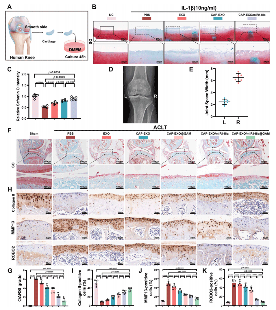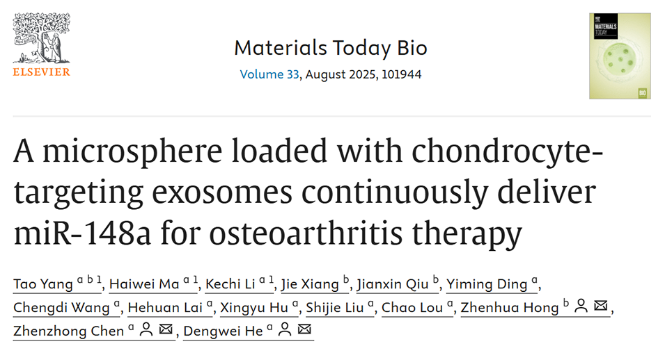 鉴于此,温州医科大学附属第五医院何登伟、陈振中团队联合台州医院洪正华团队研发了一种搭载软骨细胞靶向外泌体的可生物降解微球(CAP-EXOs/miR-148a@GAM),以实现miR-148a的持续递送,该微球在体外和体内实验中均展现出促进软骨细胞合成代谢、延缓软骨退变的良好效果。相关研究以“A microsphere loaded with chondrocyte-targeting exosomes continuously deliver miR-148a for osteoarthritis therapy”为题目,发表在期刊《Materials Today Bio》上。
