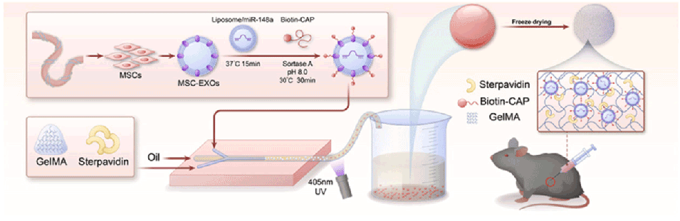 1、本研究通过微流控系统合成了含甲基丙烯酰化明胶和链霉亲和素的微球(GAM),将miR-148a载入经软骨靶向肽CAP修饰的外泌体(CAP-EXOs),并将其包封入GAM,得到CAP-EXOs/miR148a@GAM。