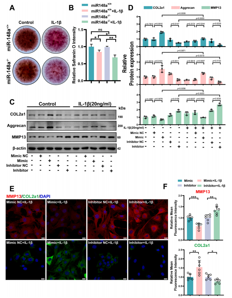 图2. miR-148a通过抑制IL-1β诱导的细胞外基质分解代谢阻碍软骨退变