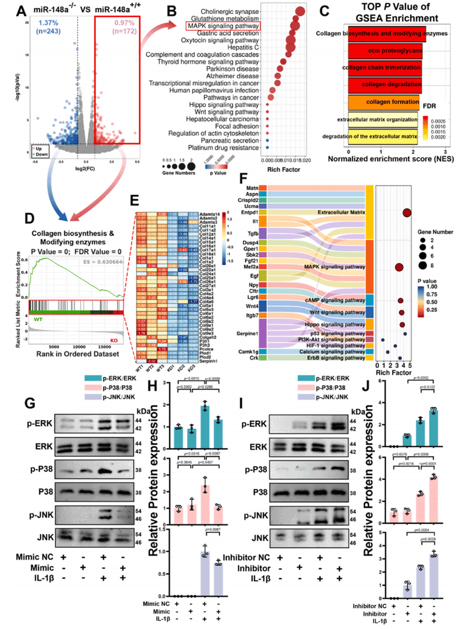 图4. miR-148a通过抑制MAPK信号通路的激活改善IL-1β诱导的细胞外基质分解代谢