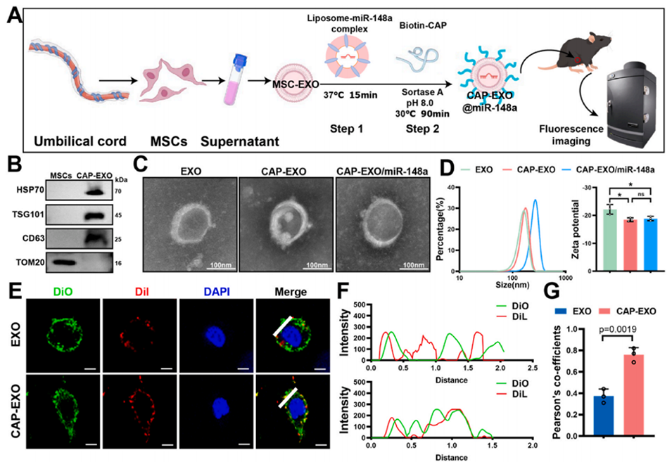 图5.具有软骨细胞靶向能力的CAP-EXO@miR-148a的分离、工程化及表征