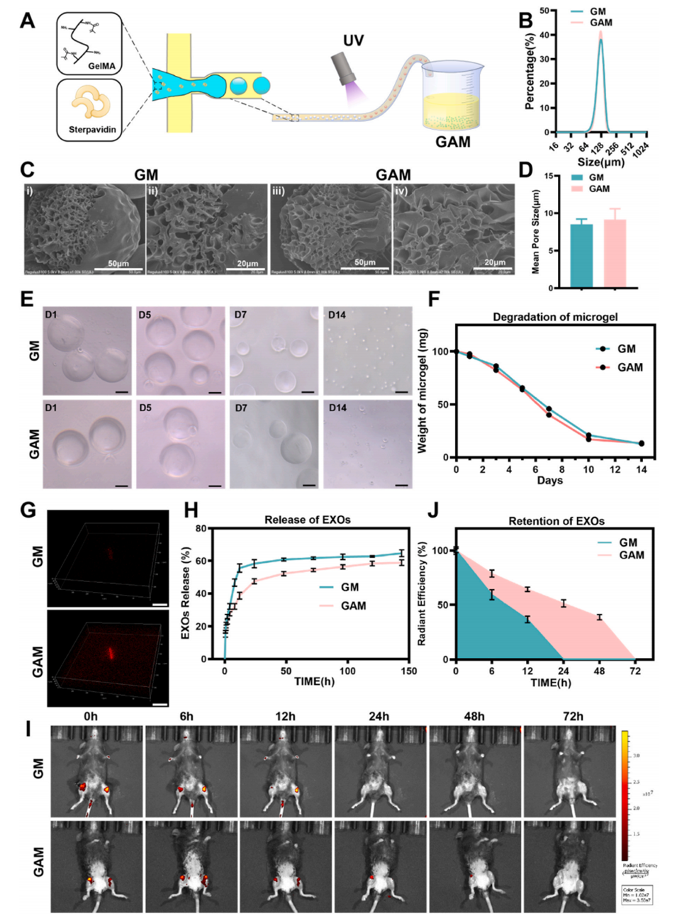 通过该方法制备的GAM微球粒径约124.3 μm,具有多孔结构(平均孔径8 μm),具备良好的生物相容性和可降解性,为后续负载靶向外泌体奠定了基础。