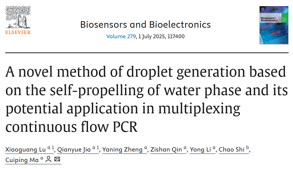 近期,青岛科技大学马翠萍教授团队提出了一种基于水相自驱动的新型液滴生成方法,该方法利用拉普拉斯压力原理和分时流体加载生成液滴,简化了芯片设计与操作,并成功将其应用于多重连续流PCR,实现了多目标的快速检测。相关研究以“A novel method of droplet generation based on the self-propelling of water phase and its potential application in multiplexing continuous flow PCR”为题目,发表在期刊《Biosensors and Bioelectronics》上。