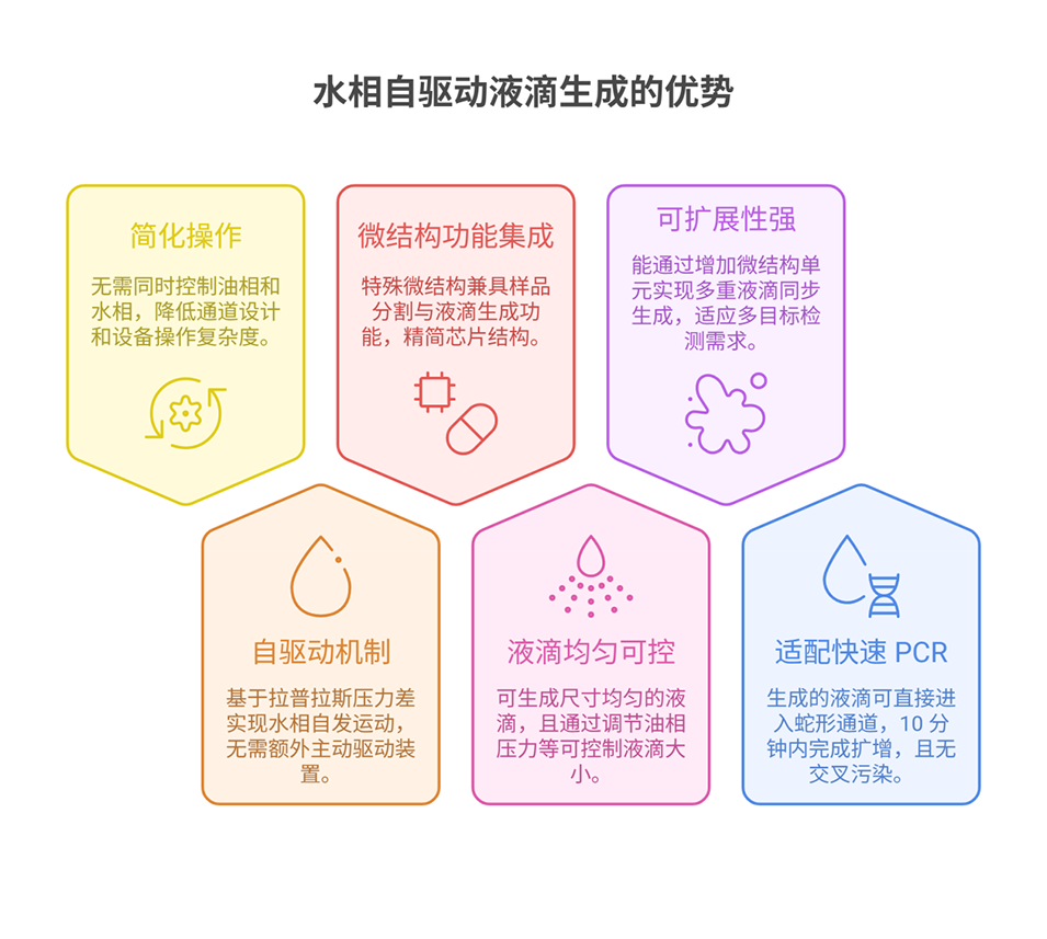 1、本文介绍了一种基于水相自驱动的新型液滴生成方法及其在多重连续流PCR(CF-PCR)中的潜在应用。