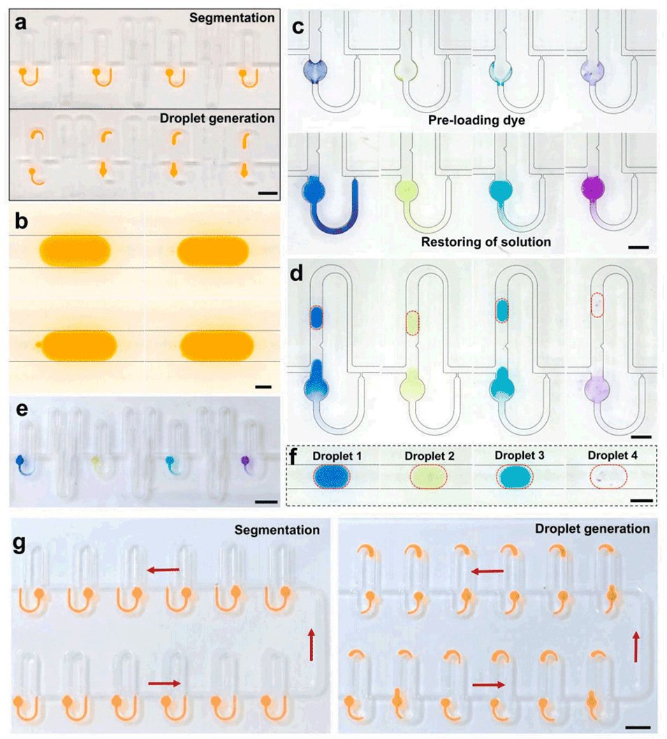 1、时序操作替代同步操控:先加载样本溶液至微结构捕获区,再注入油相,通过油-水界面曲率差异(ΔP=2γ(1/R2−1/R1))驱动水相自发迁移,仅需调控油相压力即可生成液滴;