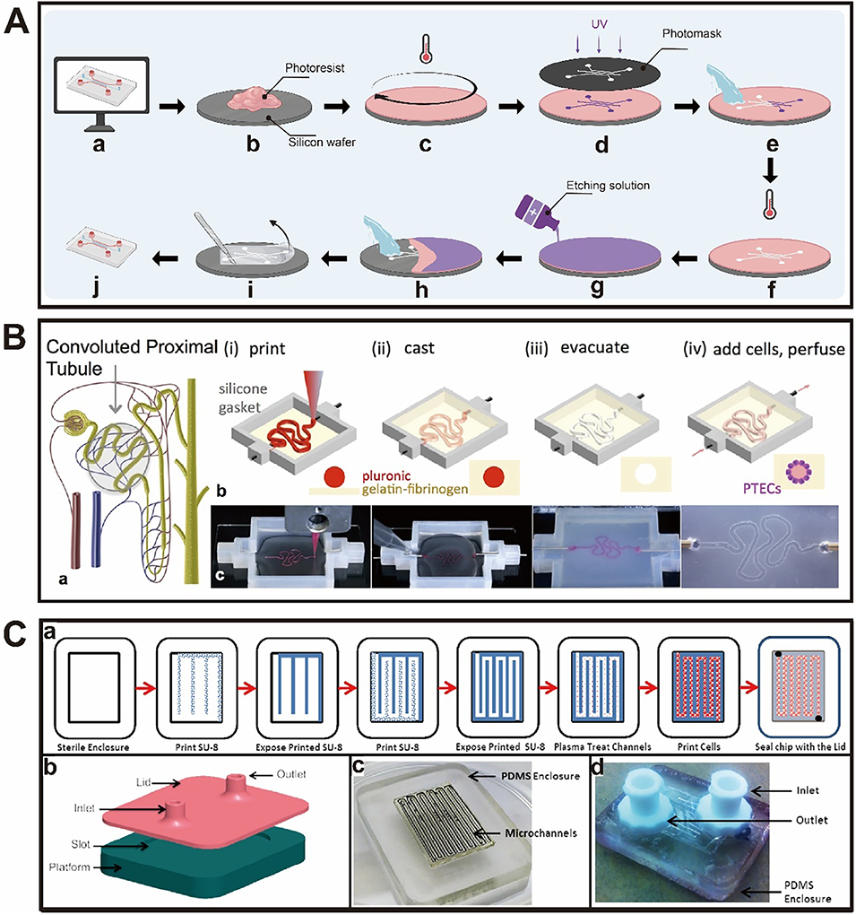 图2.器官芯片(OoC)的常见制备策略。A)软光刻制备微流控芯片的示意图。B)3D卷曲肾近端小管芯片。a)突出显示卷曲近端小管的肾单位示意图;b)和c)3D卷曲可灌注近端小管的制备步骤示意图及图像:i)先将牺牲墨水打印在明胶-纤维蛋白原细胞外基质(ECM)上;ii)在打印结构周围浇筑额外的ECM;iii)移除牺牲墨水以形成开放小管;iv)在小管内接种近端肾小管上皮细胞(PTEC)并进行长期灌注培养。C)a)细胞负载微流控芯片的制备步骤示意图;b)PDMS外壳模型;c)PDMS外壳槽内制备的微通道图像;d)带有盖子及进出口的完整细胞负载微流控芯片图像
