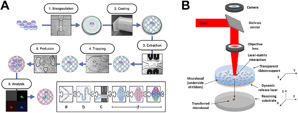 图4.水凝胶微球(HMs)整合到器官芯片(OoC)中的常见策略。A)本研究建立的克隆胚胎干细胞集落培养工作流程,步骤包括:1)a)使用基于液滴的微流控技术将单细胞包封到水凝胶液滴中(频率为291±11Hz);2)b)在冷却管路中孵育,使微液滴内形成水凝胶(以灰色图案表示);3)c)包封单细胞的水凝胶微球液滴在芯片上通过电聚结进行在线破乳,该步骤在包封后连续进行;4)水凝胶微球的空间固定;5)长期灌注培养及延时显微镜观察;6)d)在捕获装置中进行分析(如荧光检测、免疫染色、实时定量PCR)。B)激光直写(LDW)系统同步定位并打印微球到基底预设图案位点的示意图。单个激光脉冲作用于紫外透明带,使目标微球所在的动态释放层(DRL)局部蒸发;产生的蒸汽腔将含目标微球的液滴喷射到接收基底上。每次微球转移后,基底平台根据g代码蓝图移动到下一个图案位置