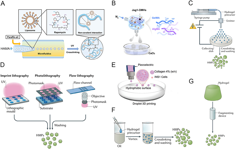 图3.水凝胶微球(HMs)的常见制备策略。A)微流控技术用于制备雷帕霉素脂质体(RAPA@Lipos)、光交联HAMA基质及微流控雷帕霉素脂质体-水凝胶微球(RAPA@Lipo@HMs)。B)气动微流控技术用于制备矿化水凝胶微球(MHMs)的过程。C)电流体喷雾技术:利用电场力使流动的溶液带电形成液滴,随后交联成水凝胶。D)光刻技术:以掩模或模具为模板制备微米级水凝胶。E)3D生物打印技术:示意图展示使用不同浓度单宁酸(TA)溶液交联制备INS-1E细胞负载球状体的过程。F)批量乳化技术:将互不相溶的液体(如油水)混合形成液滴,随后交联形成水凝胶微球。G)机械破碎技术:利用机械力将预制水凝胶破碎成更小颗粒。蓝色阴影表示未交联溶液,绿色阴影表示交联的水凝胶微粒或水凝胶。UV:紫外线