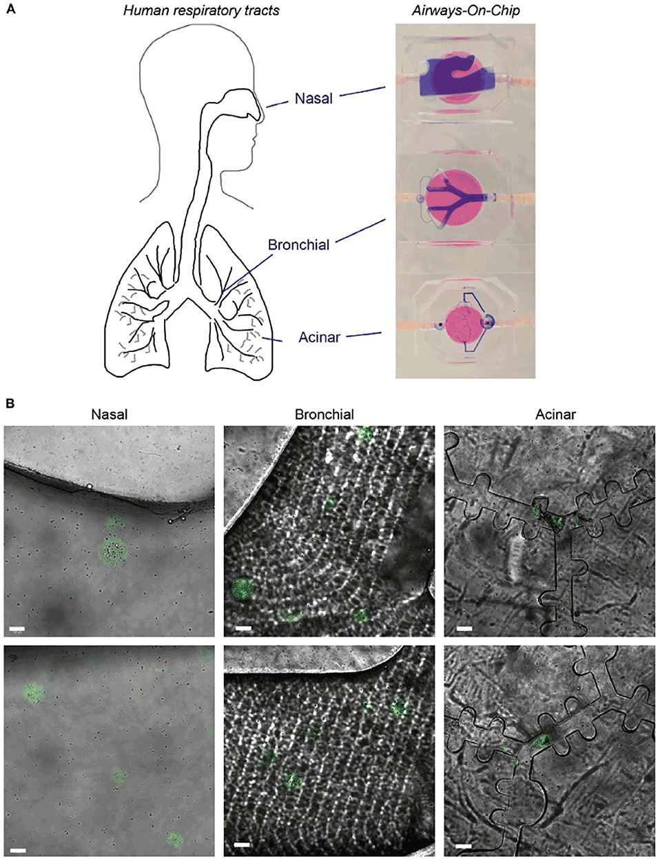 图6.微球递送至人体呼吸道模型。A)人体呼吸道(鼻腔、支气管和肺泡)及对应的呼吸道芯片模型示意图。模型中注入台盼蓝以显示腔室内的流动情况。B)鼻腔、支气管和肺泡腔室的共聚焦图像,显示钙黄绿素染色的微球(绿色)。展示三个独立实验中每个腔室的两张代表性图像。比例尺100μm