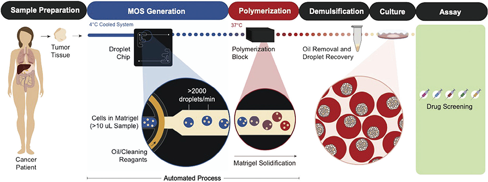 图7.结直肠癌微器官球(CRC MOS)的建立及其在药物筛选与临床验证中的应用。结直肠癌微器官球的制备及药物筛选流程