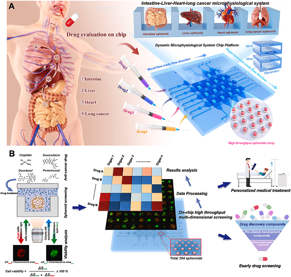 图8.微生理系统芯片平台(MSCP)可构建微生理系统并进行全面药物筛选。A)左:口服抗肺癌药物吸收过程示意图,显示药物在肠道吸收后通过血管流经肝、心、肺等重要器官;右:MSCP可构建高通量肠-肝-心-肺癌微生理系统,同时评估四种不同药物。该芯片微生理系统模拟左图所示的体内过程,实现高通量、多药物同步测试的全面药物评估。B)基本检测原理、平台应用流程及前景示意图。抗癌药物作用于微孔中的球状体,通过显微镜检测活/死染色荧光反映球状体的细胞活力。MSCP集成4×4微孔阵列,可同时培养304个球状体。球状体活力数据经处理分析后,全面的药物筛选结果将以热图呈现。高通量微生理系统结合多药物同步评估,使MSCP成为个性化医疗和药物开发的便捷高效平台