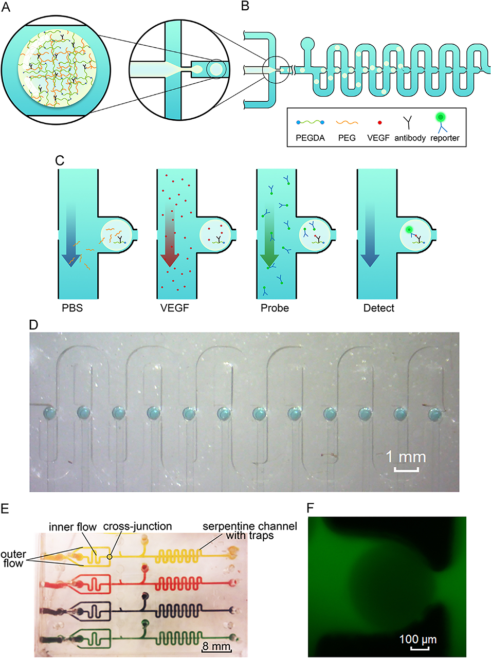 图9.检测系统示意图。A)微流控液滴生成器可在芯片上生成并调节多孔水凝胶液滴,其球形和体积可控。B)液滴生成器与蛇形捕获阵列集成,可精确定位生成的水凝胶液滴。C)此外,该系统可使捕获的液滴免受蛇形通道中试剂流的影响,实现可预测的微流控增强传质,以满足检测流程需求。D)形成一排用于蛋白质检测的捕获液滴(用食用蓝色染料染色)。E)在原型中,实现了4行12列共48个捕获位点,以展示阵列的可扩展性(实际装置中通道内有黄、红、紫、绿四种食用染料)。F)每个捕获位点包含单个多孔水凝胶液滴,其检测动力学可预测,如250kDa异硫氰酸荧光素(FITC)染料的渗透所示