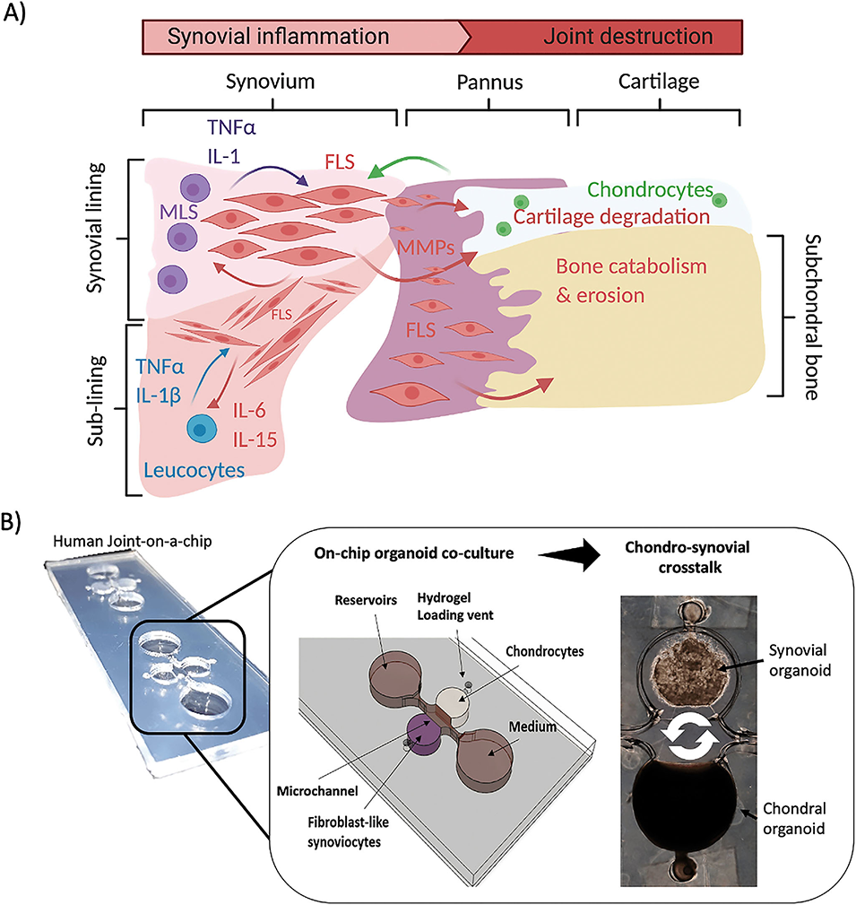 图10.A)滑膜活动影响滑膜膝关节软骨和软骨下骨的示意图。B)基于类器官的关节芯片共培养系统概述,该系统包含软骨和滑膜腔室,用于研究相互的炎症交叉对话
