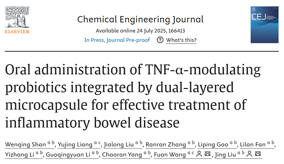 近期,武汉大学中南医院消化内科刘静教授与化学与分子科学学院王富安教授合作,研发出一种名为EcN-Ap@A/H-Ce的双层微胶囊口服系统,该系统通过将TNF-α适配体修饰的益生菌封装于海藻酸钠微球并外层复合透明质酸与CeO2纳米酶,可高效抵抗胃肠道环境、靶向结肠,通过中和TNF-α、清除ROS及调节肠道菌群发挥治疗作用,疗效优于传统口服药物且与静脉注射药物相当。相关研究以“Oral administration of TNF-α-modulating probiotics integrated by dual-layered microcapsule for effective treatment of inflammatory bowel disease”为题目,发表在期刊《Chemical Engineering Journal》上。