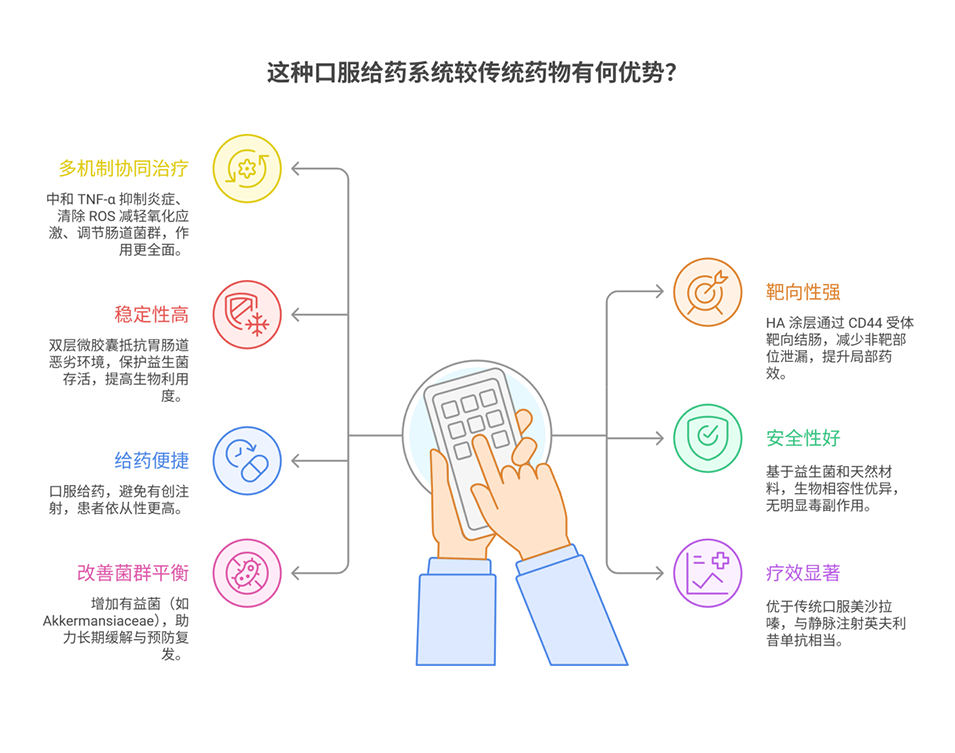 5、在小鼠结肠炎模型中,其疗效优于传统口服美沙拉嗪,与静脉注射英夫利昔单抗相当且无创。此外,这种微胶囊还能改善肠道菌群,为IBD等胃肠道疾病提供低副作用、高依从性的非侵入性疗法。